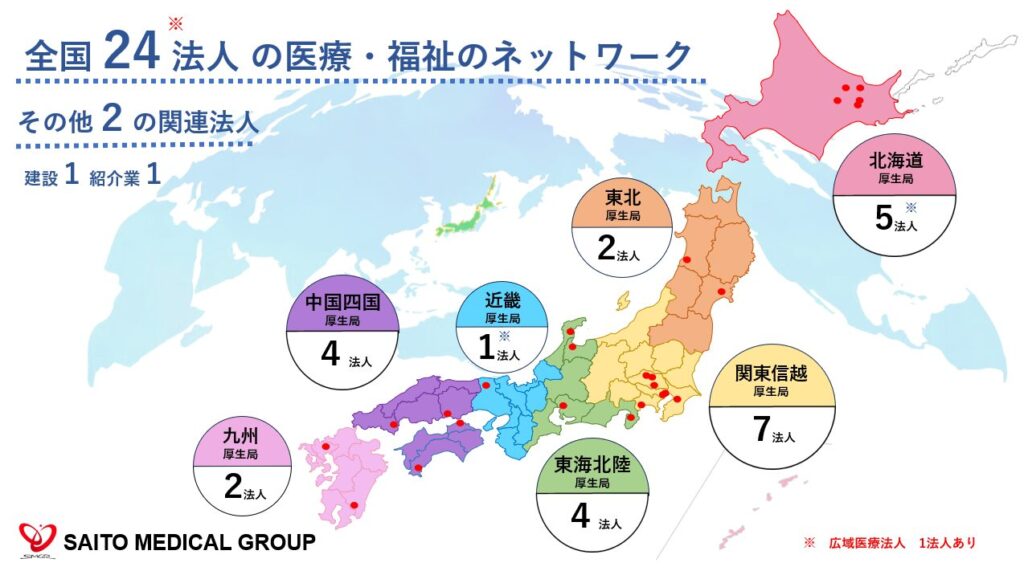 SAITO MEDICAL GROUPは、全国すべての厚生局管内に医療・福祉のネットワークを展開しています。